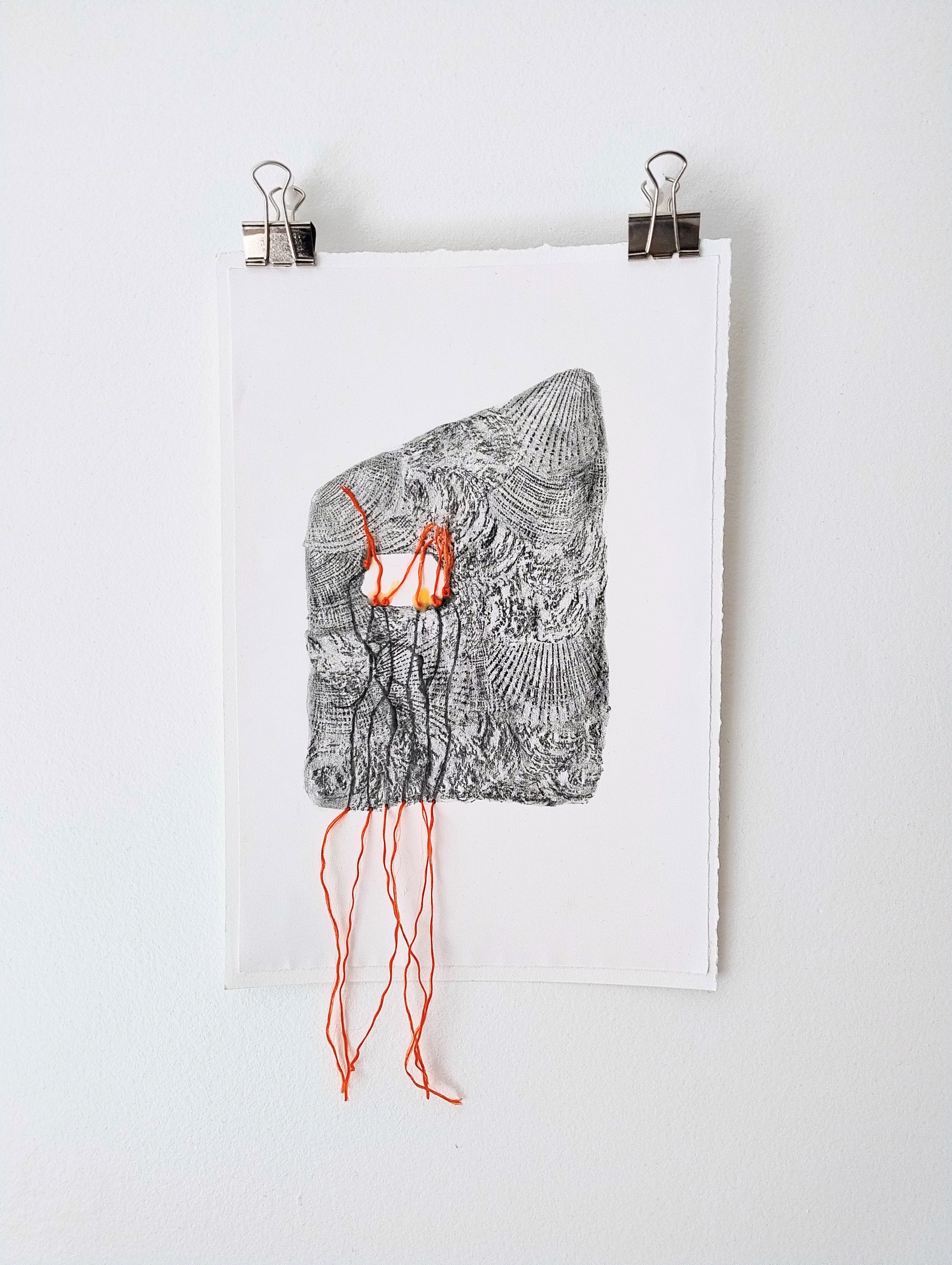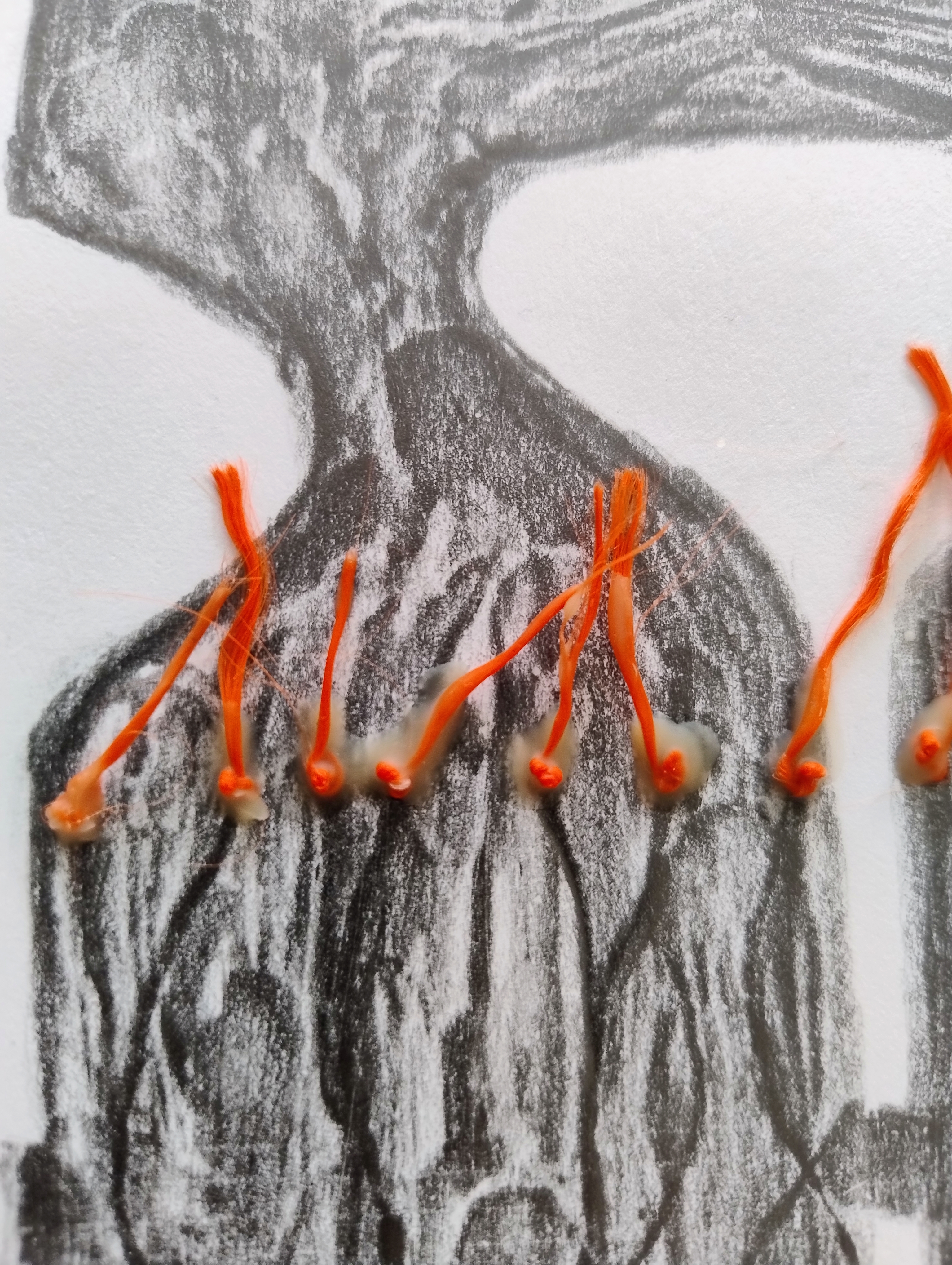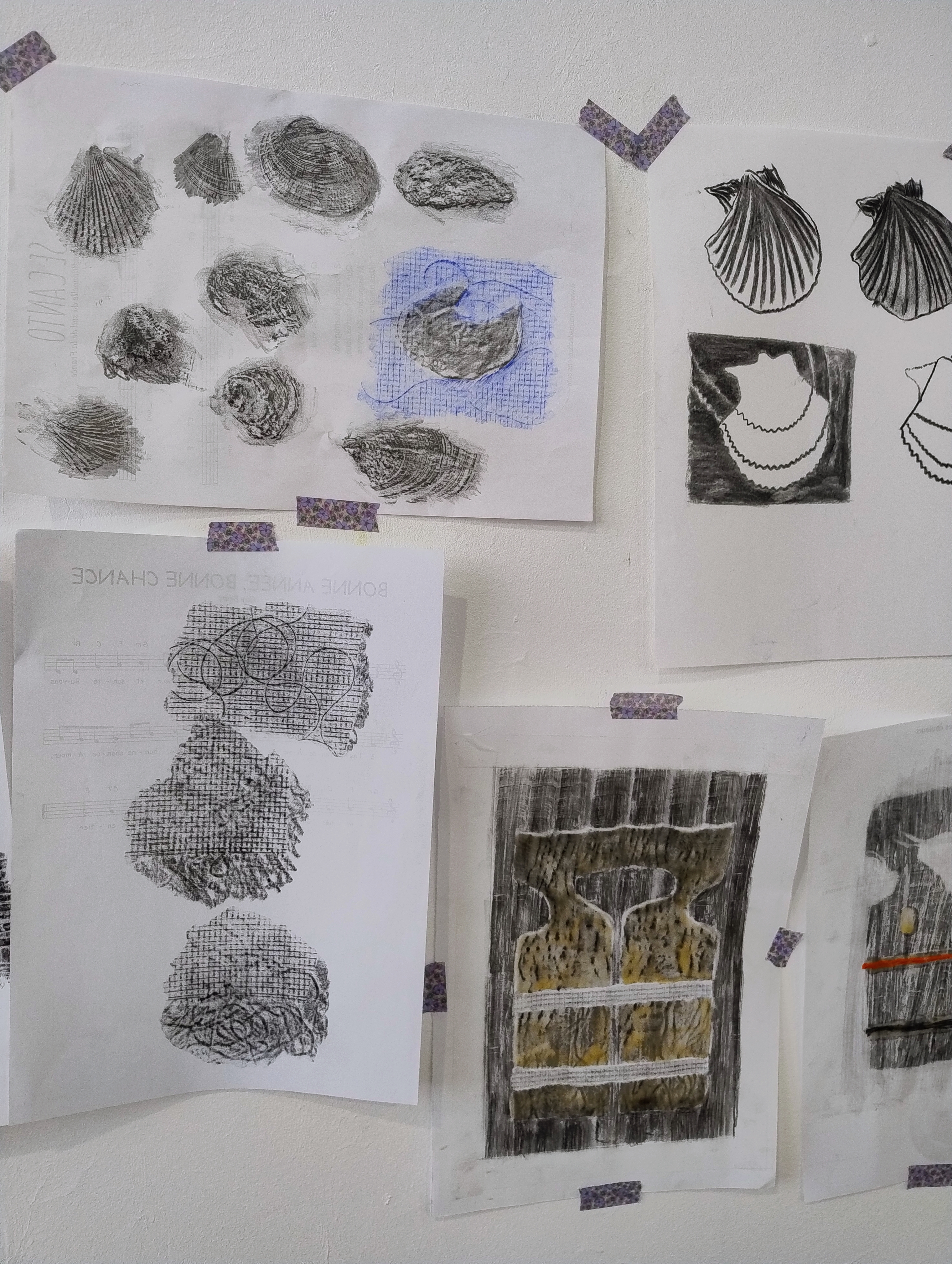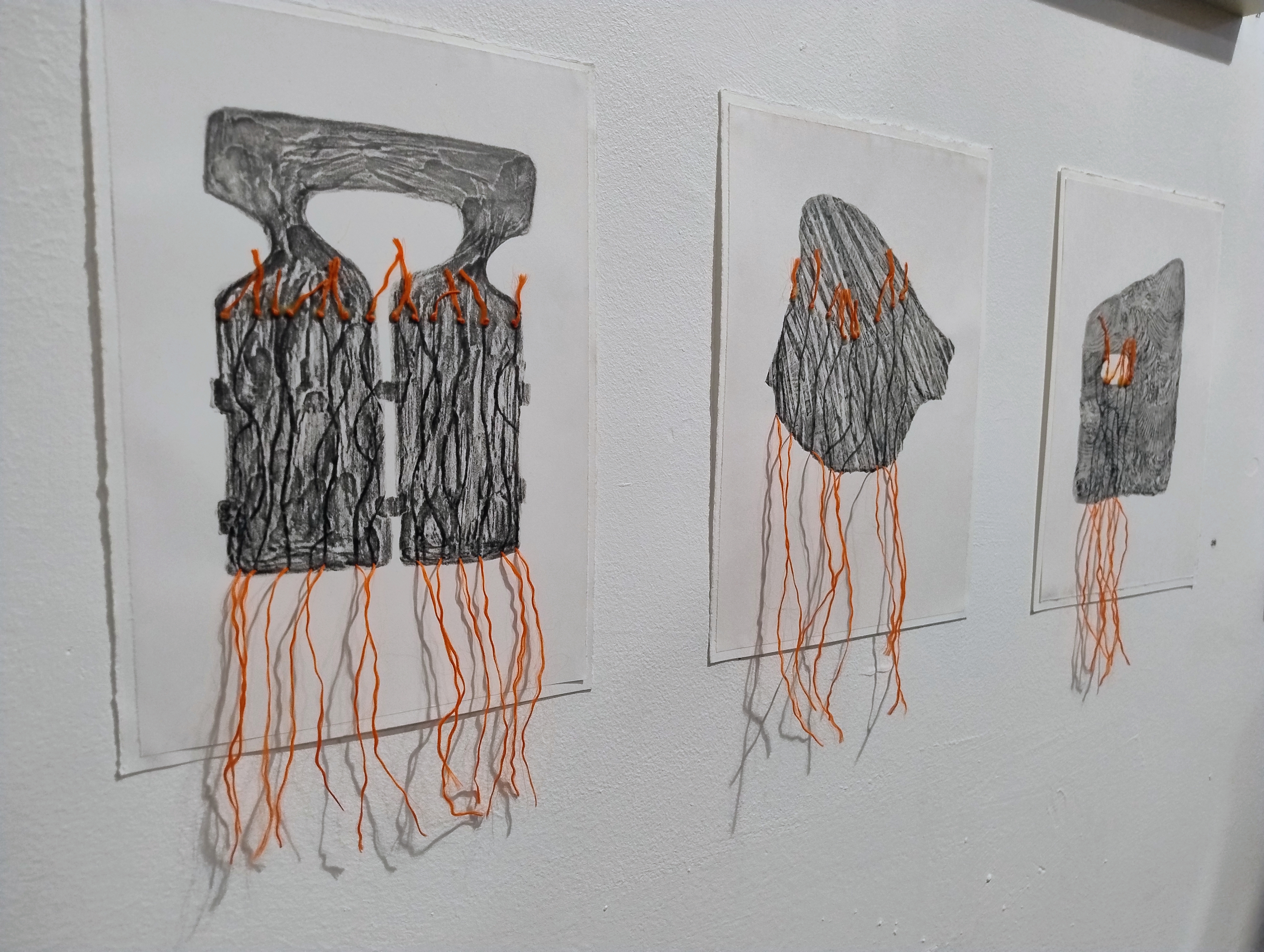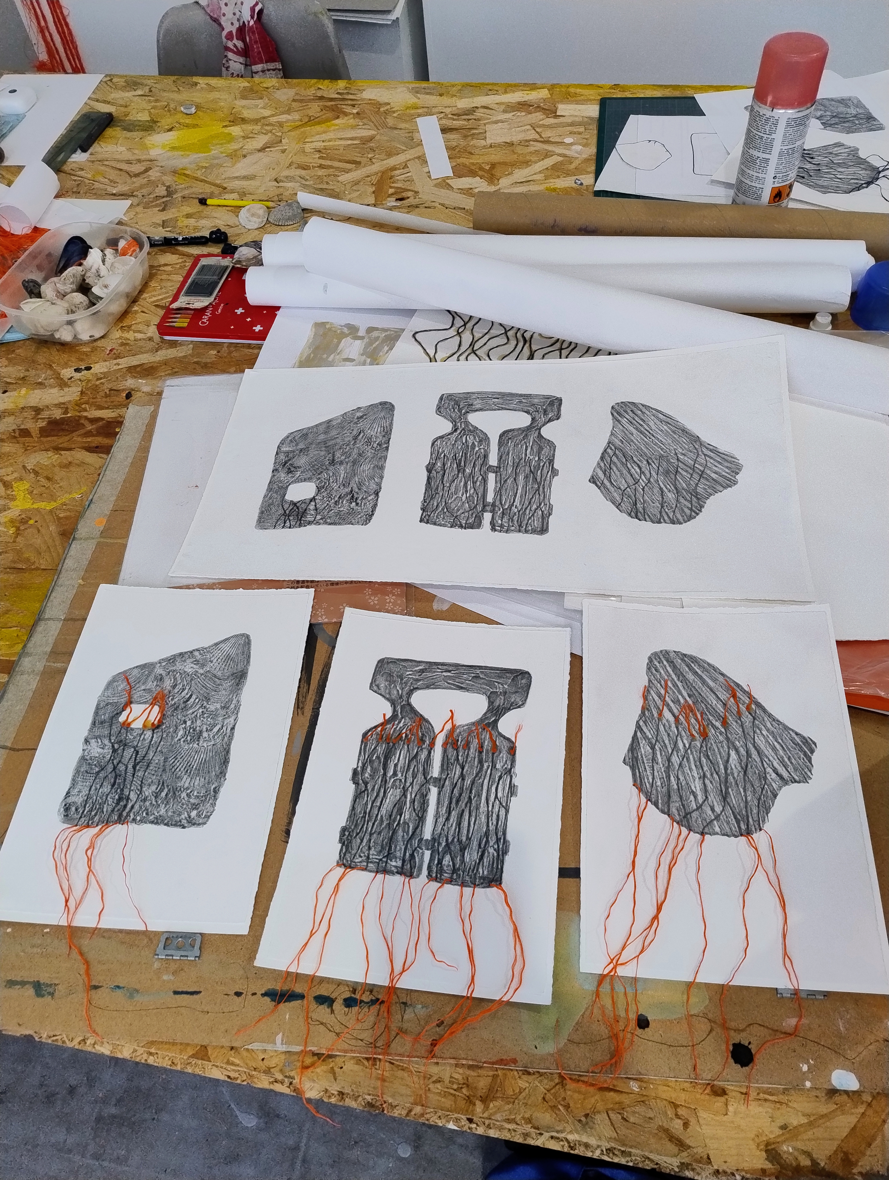 Les thématiques de la mer, du déplacement, du coquillage-maison ont ressurgi. Avec une urgence et fil orange, alerte, danger. Répétition des motifs par le frottement enfantin, simplicité des moyens et matériaux.