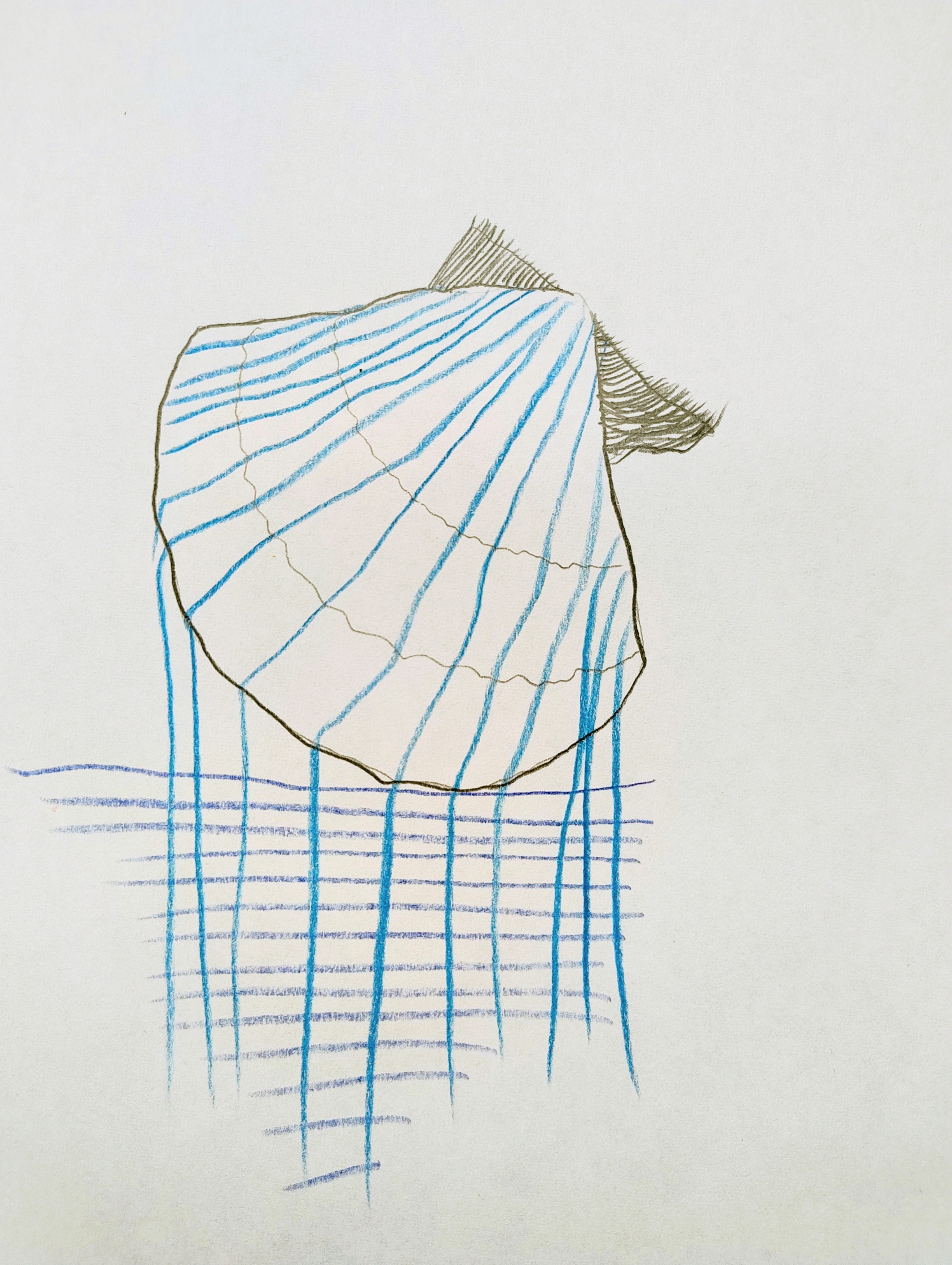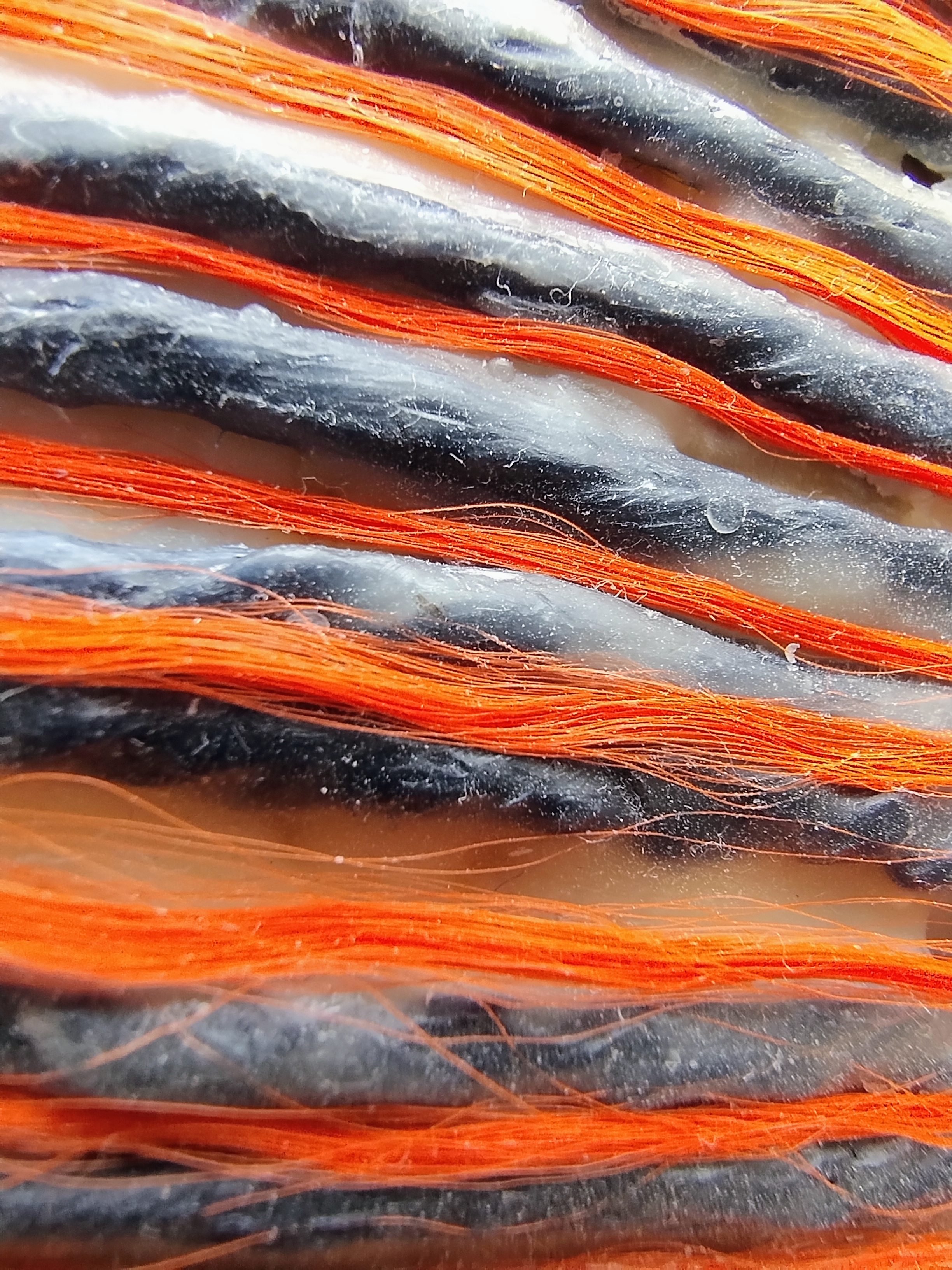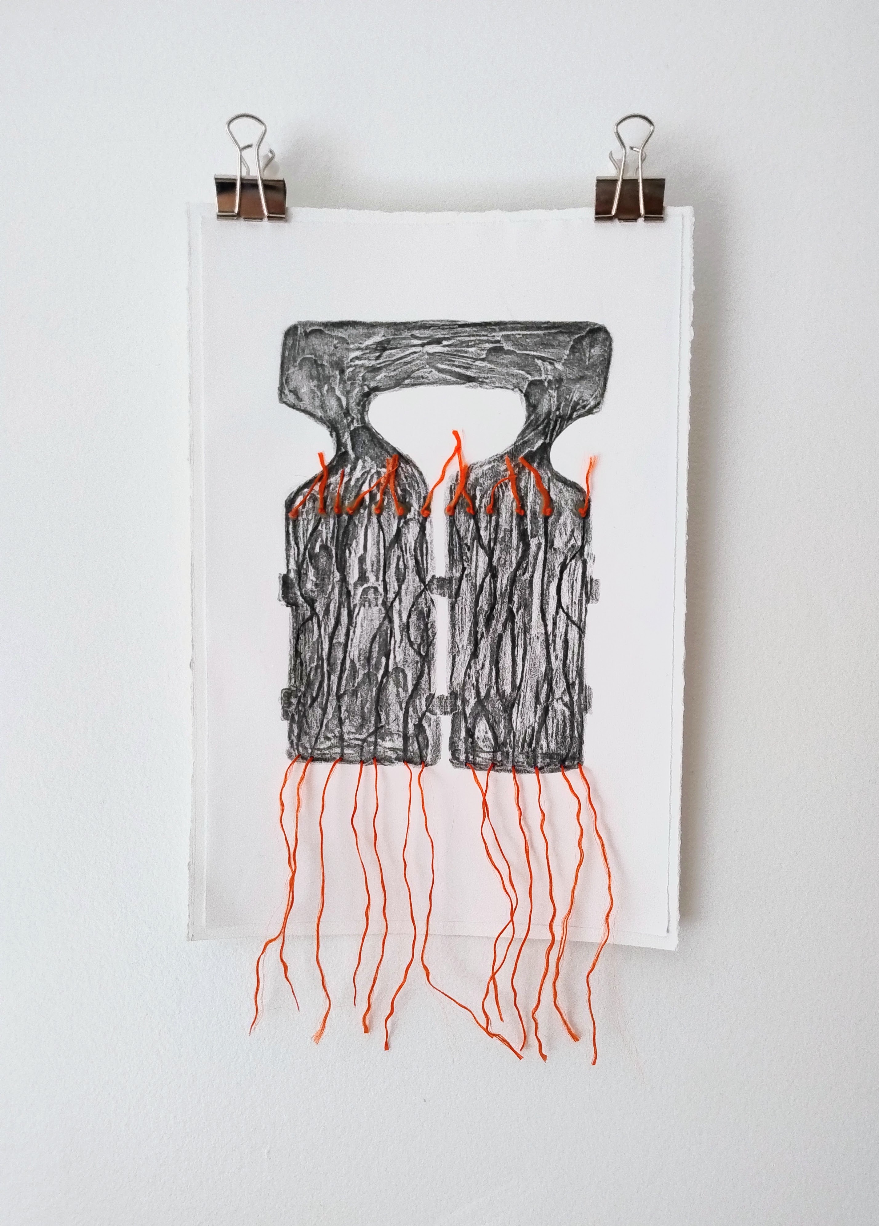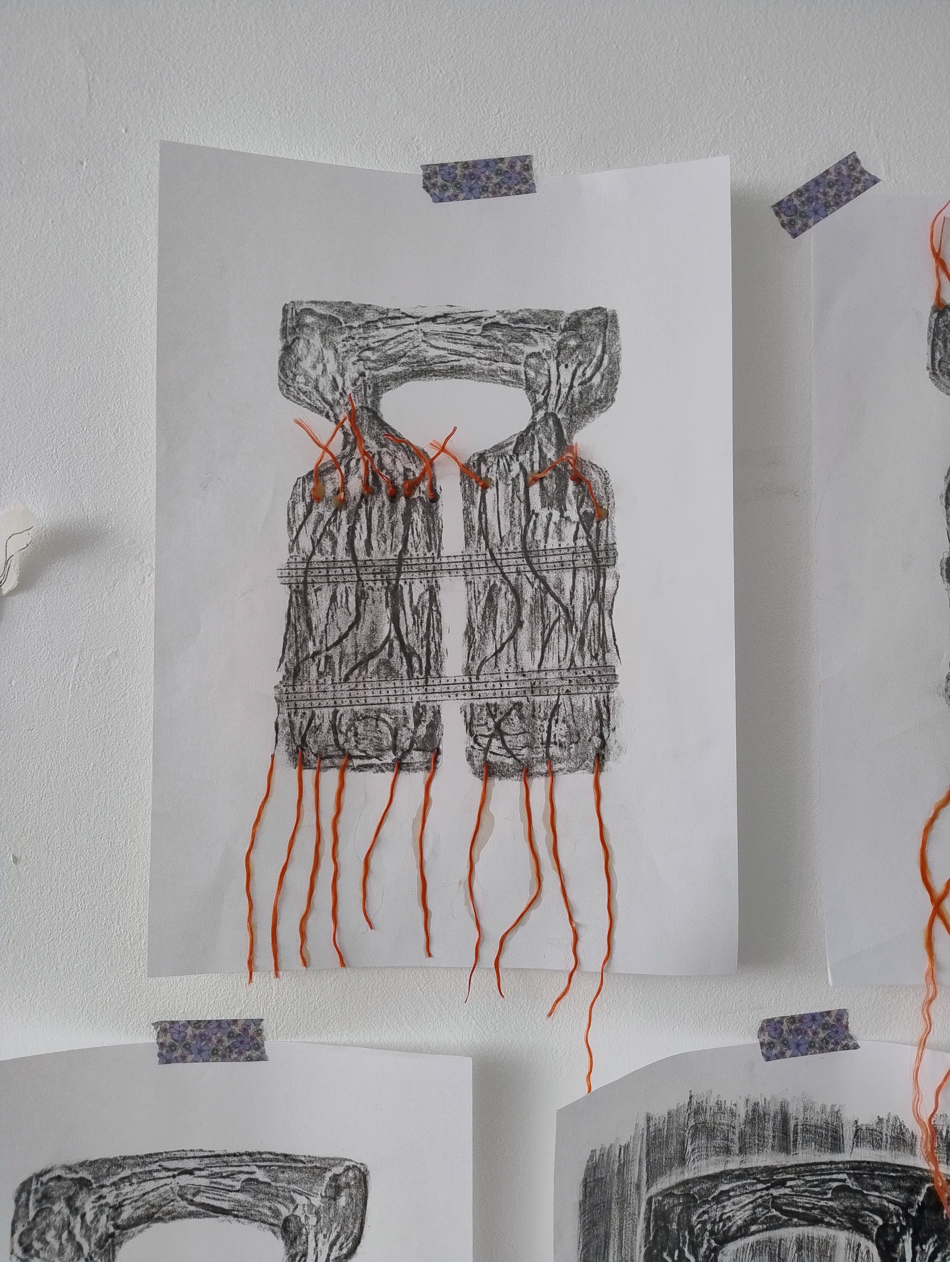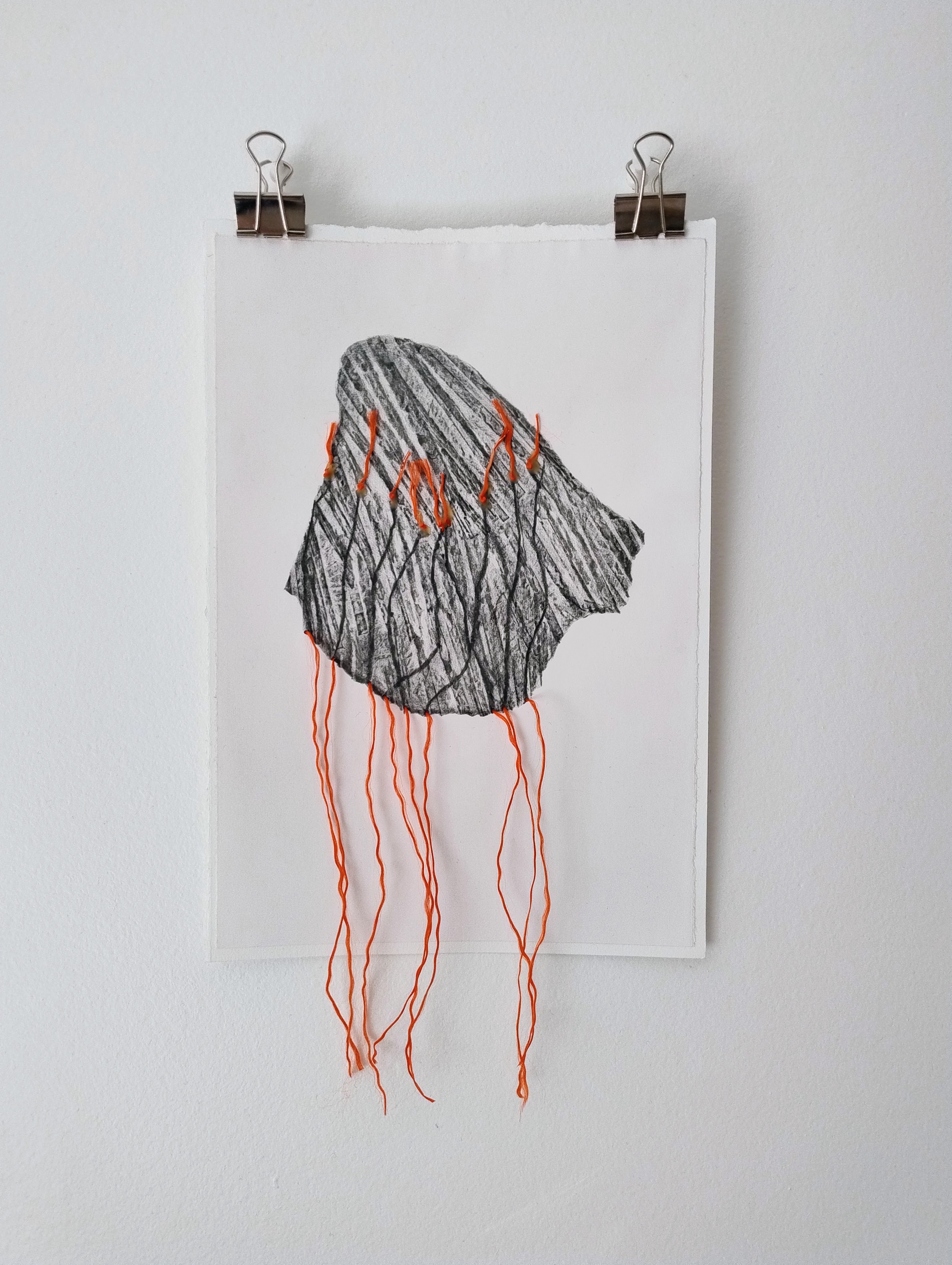 Les thématiques de la mer, du déplacement, du coquillage-maison ont ressurgi. Avec une urgence et fil orange, alerte, danger. Répétition des motifs par le frottement enfantin, simplicité des moyens et matériaux.