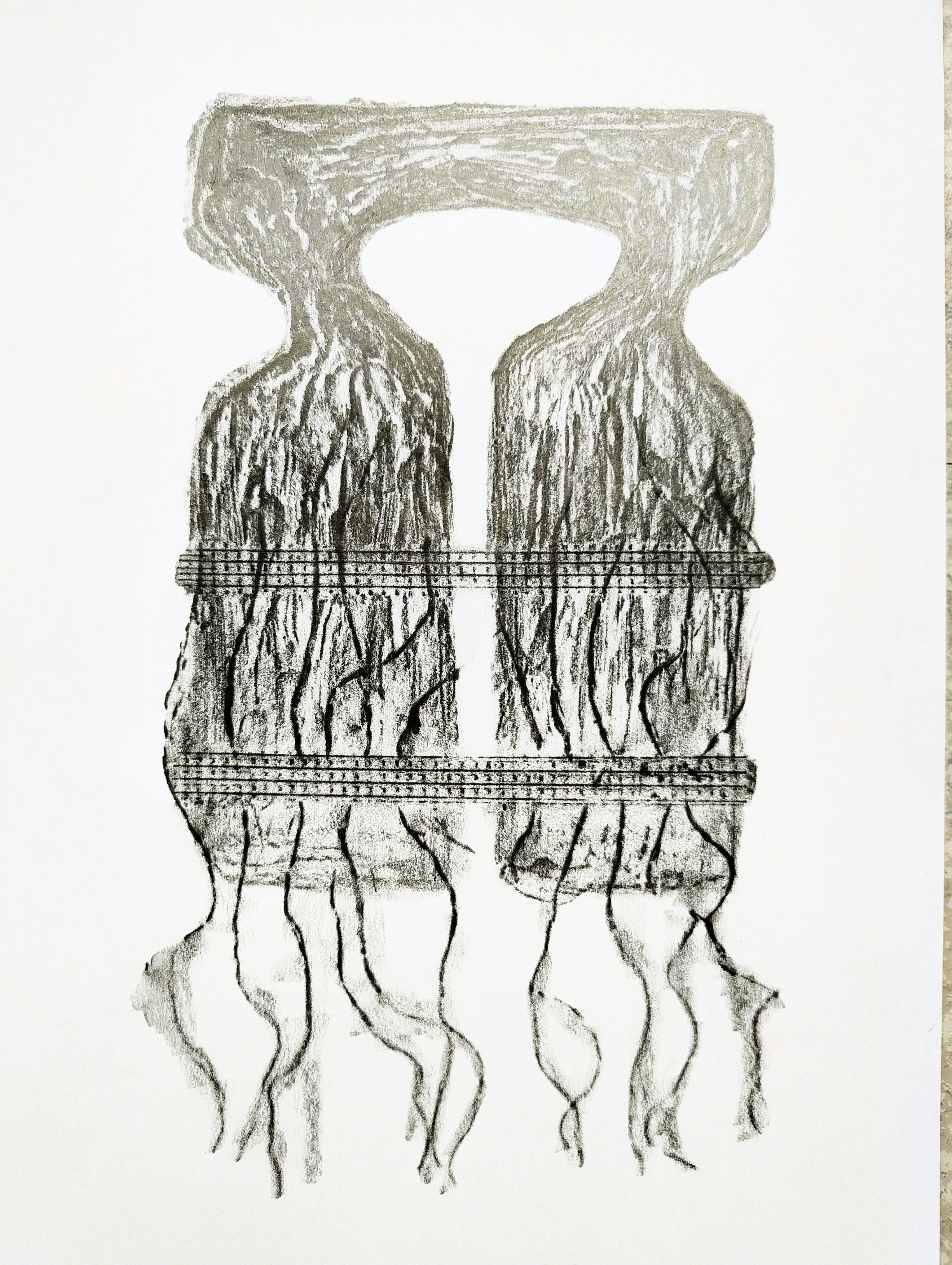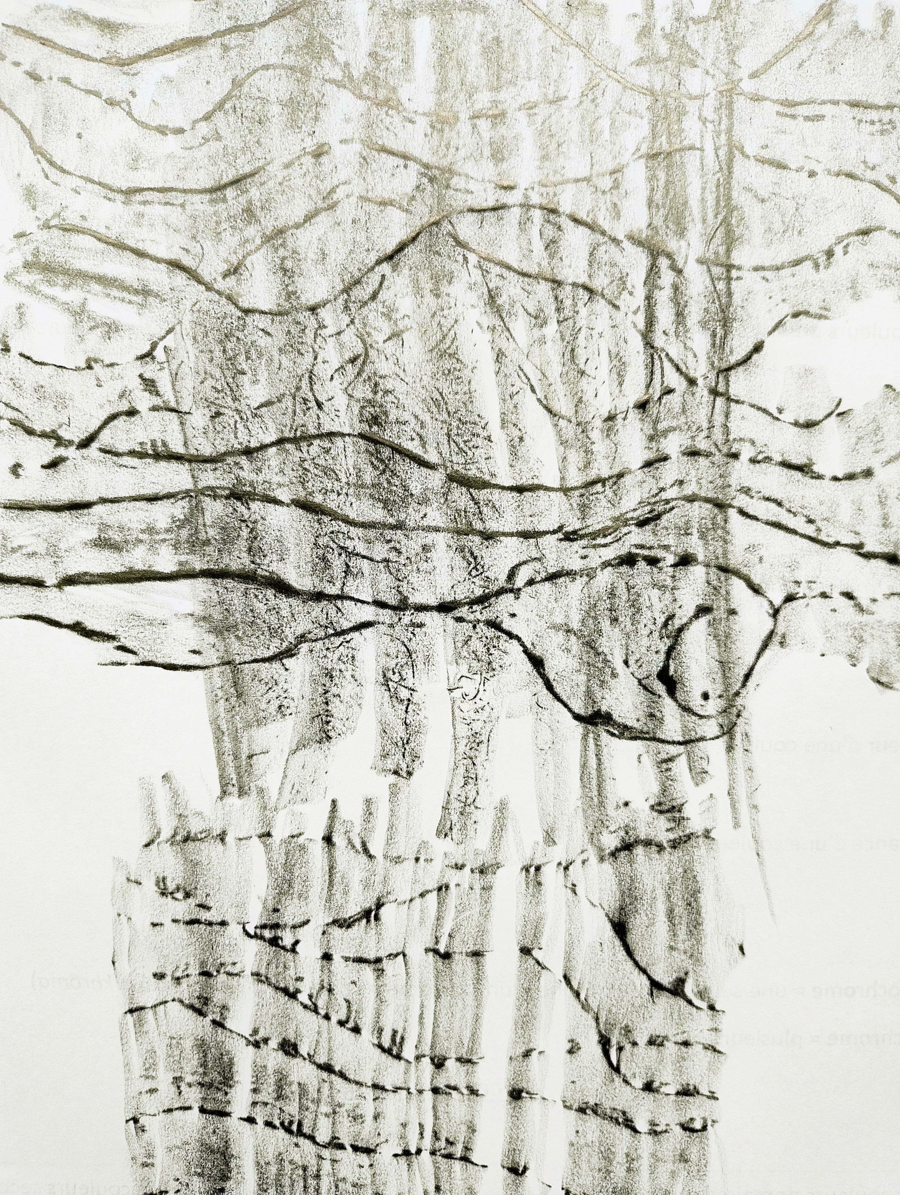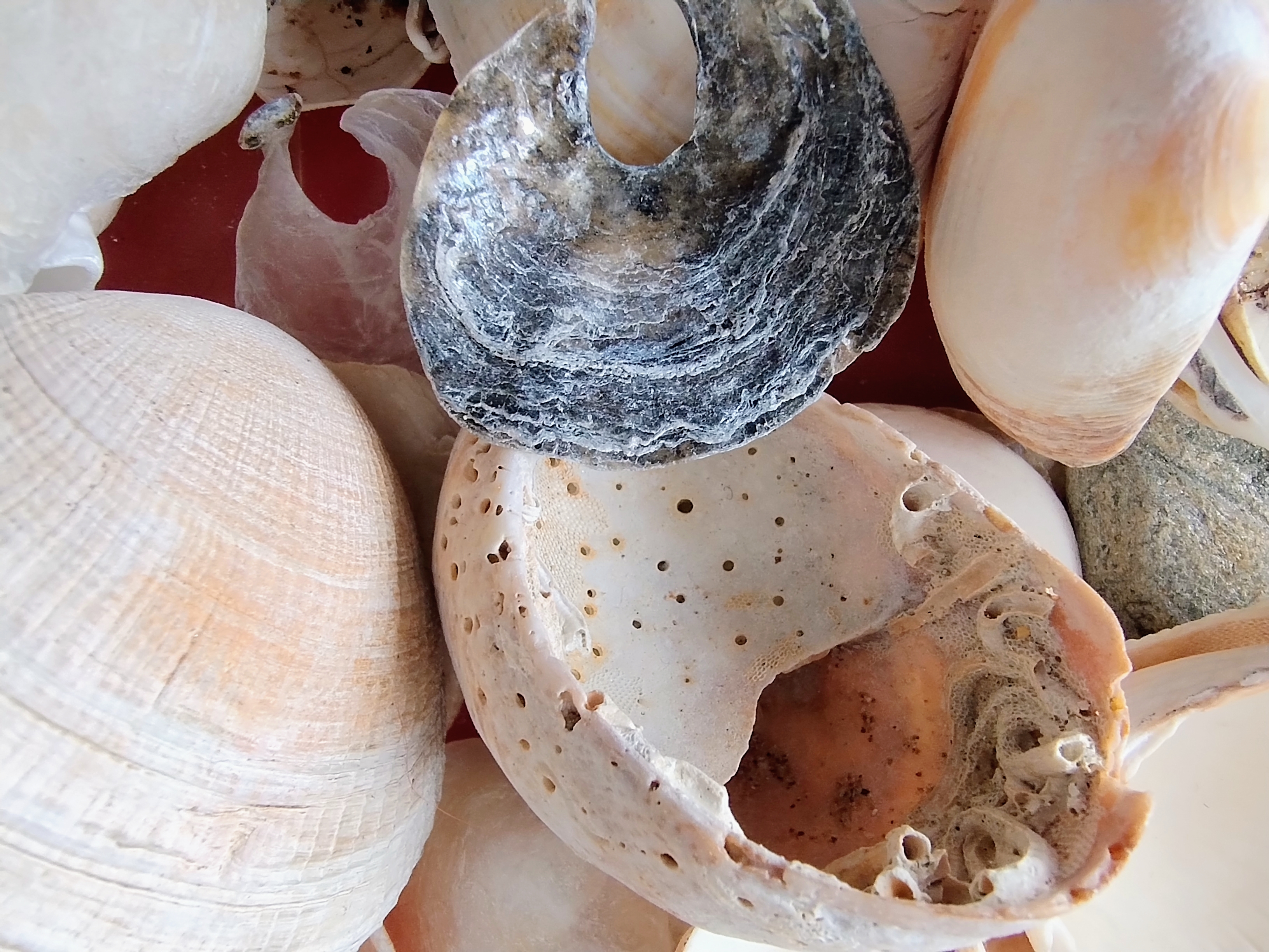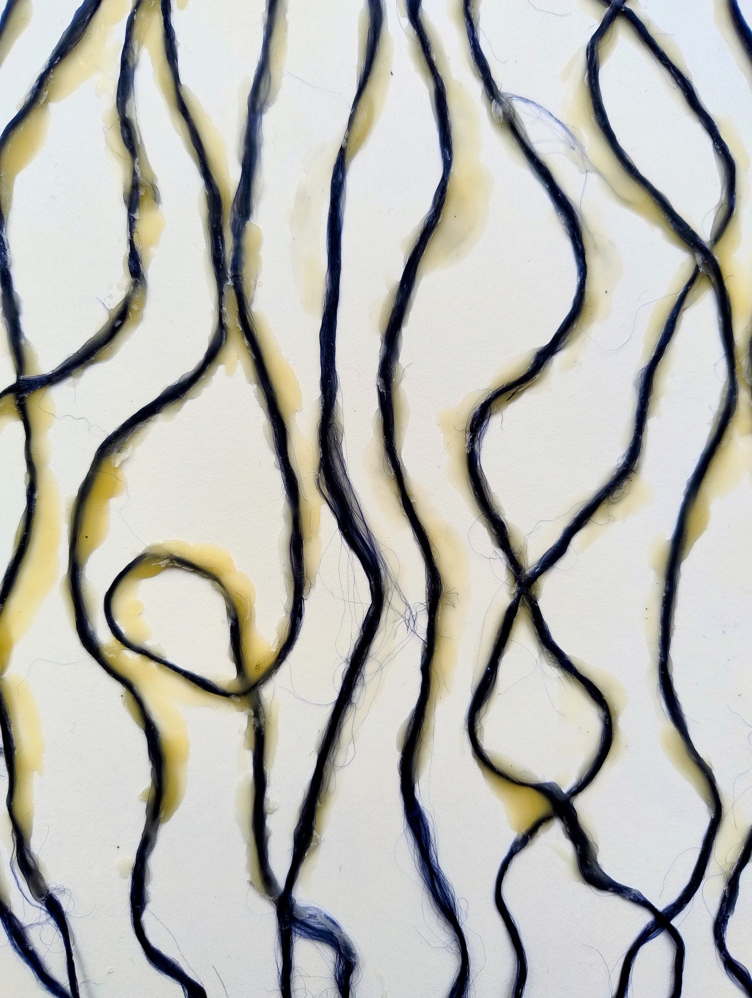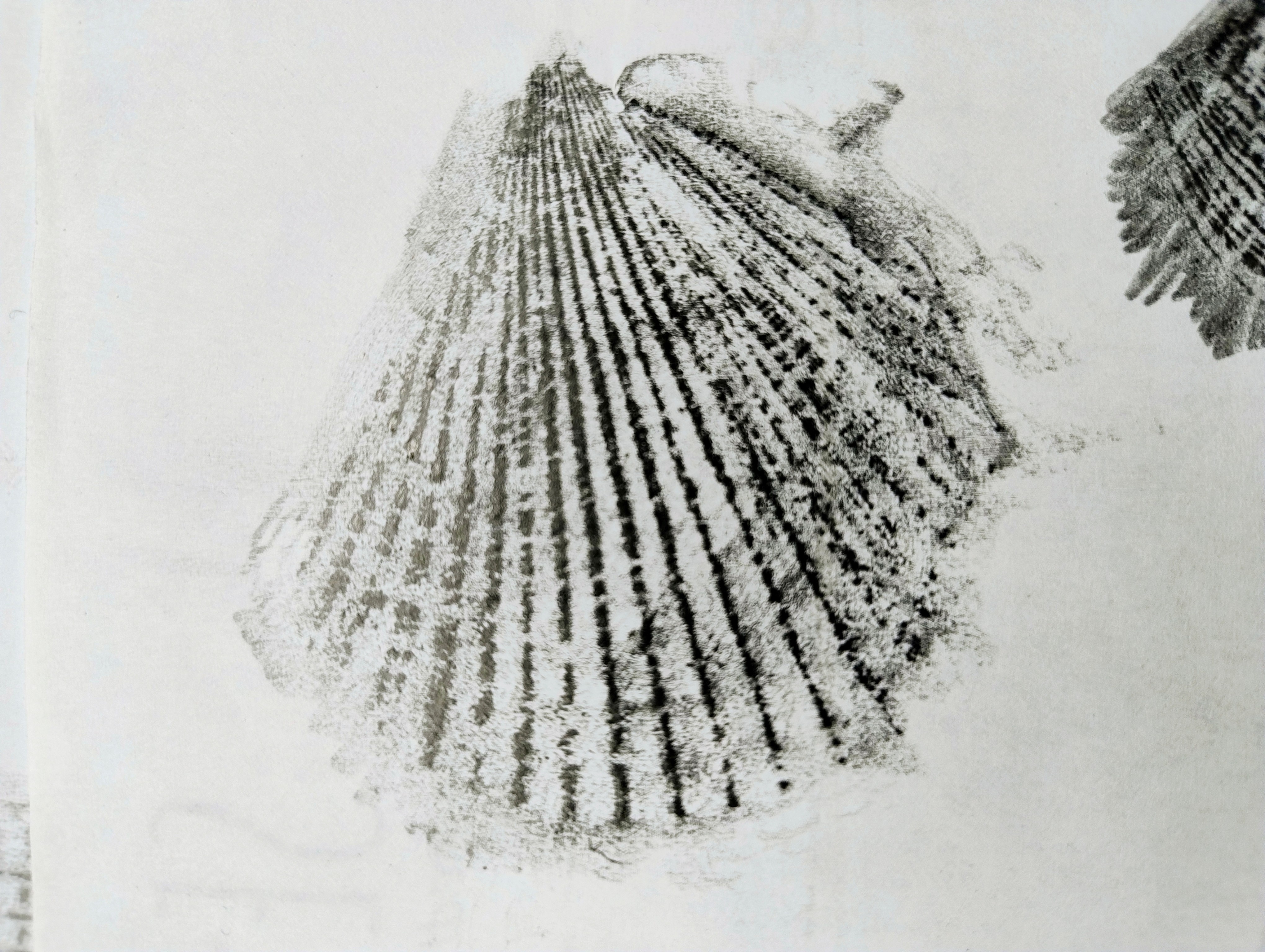 Les thématiques de la mer, du déplacement, du coquillage-maison ont ressurgi. Avec une urgence et fil orange, alerte, danger. Répétition des motifs par le frottement enfantin, simplicité des moyens et matériaux.