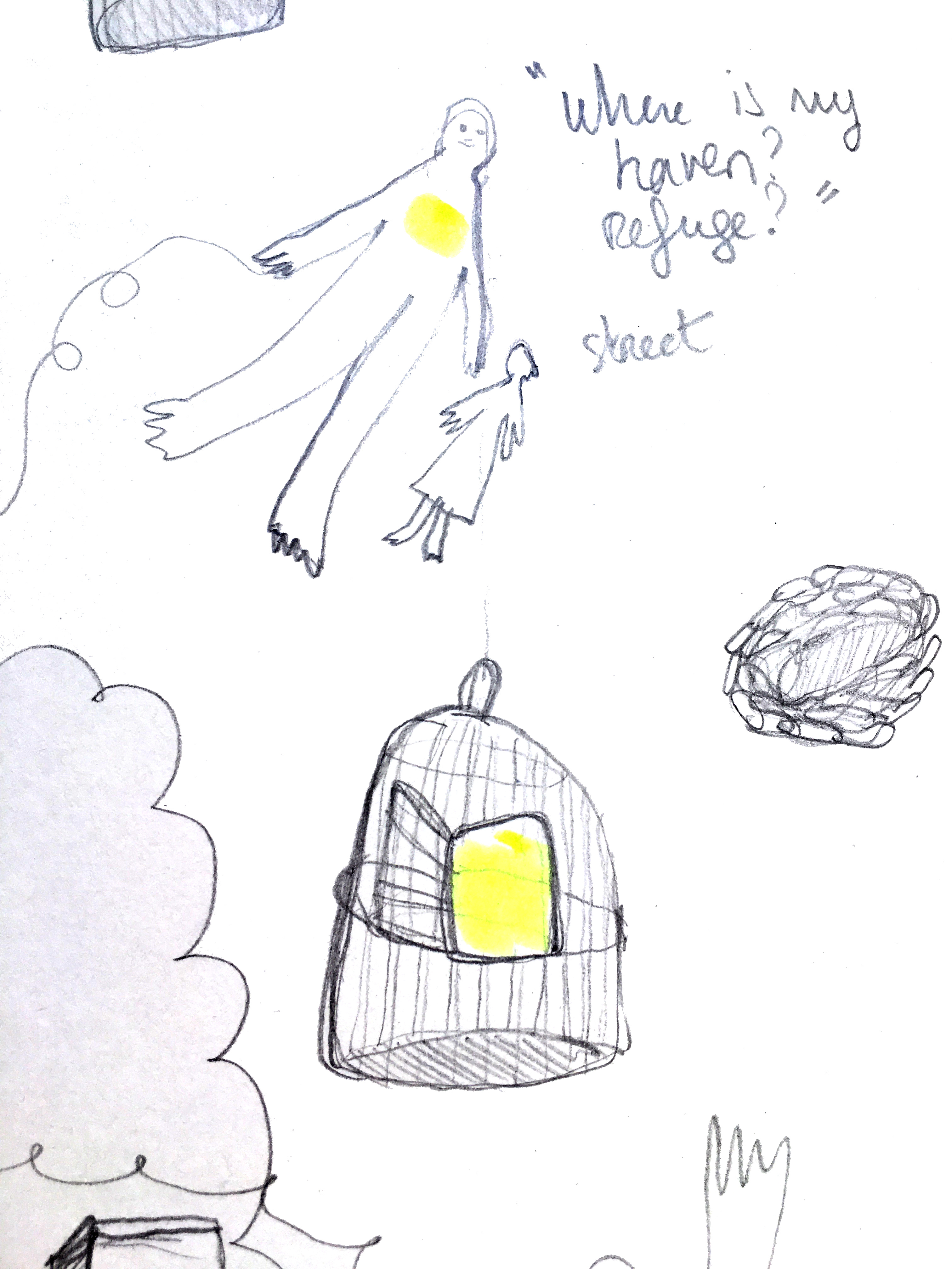Dorothea decided to go with collage and a poem about bees written by Emily Dickinson. To the artist, the poem is about making things with dreams and hope and hard work. It’s about building habitats in any conditions.