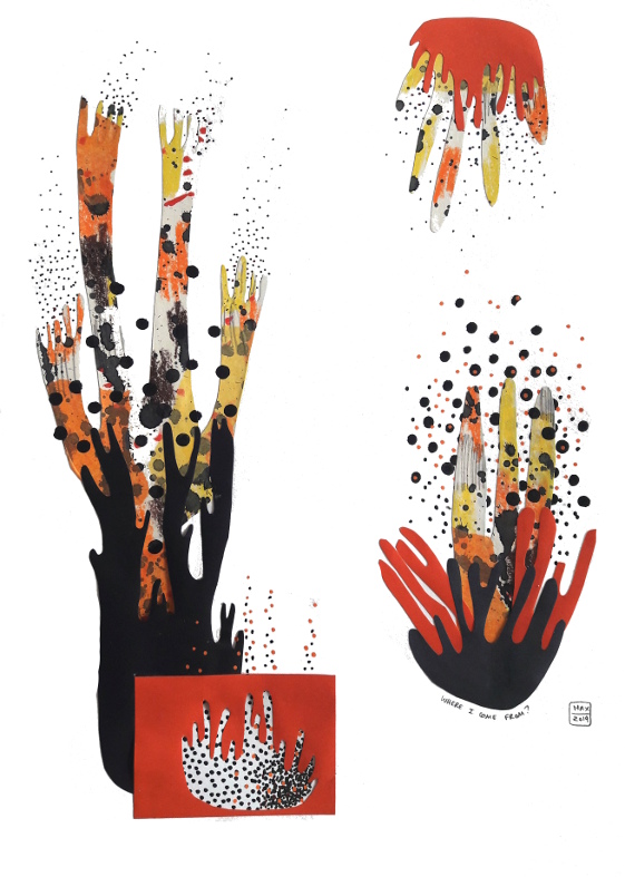 I played with collage from old linocuts in 2018 and made this triptych. Most of the time my work creates rising pictures. For « Where I come from », my work is between up and down, between earth or sea and star, sky, cosmos…